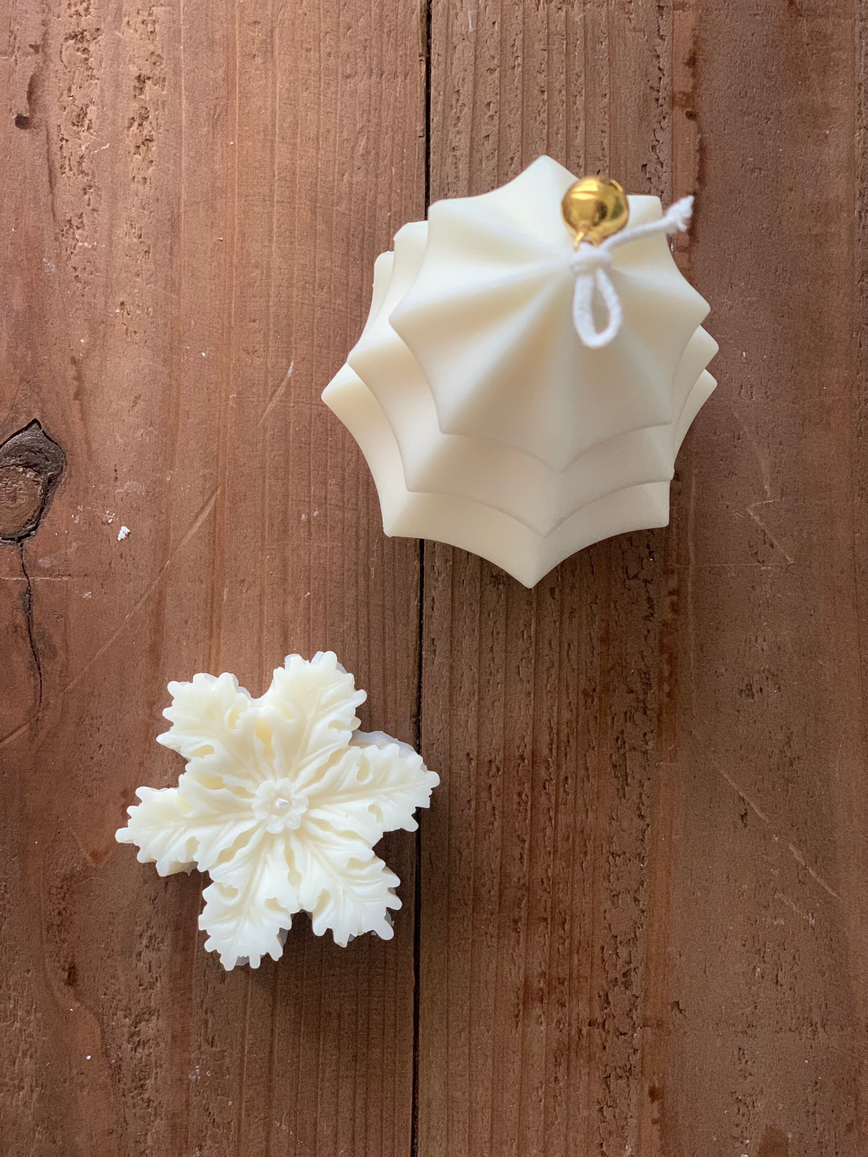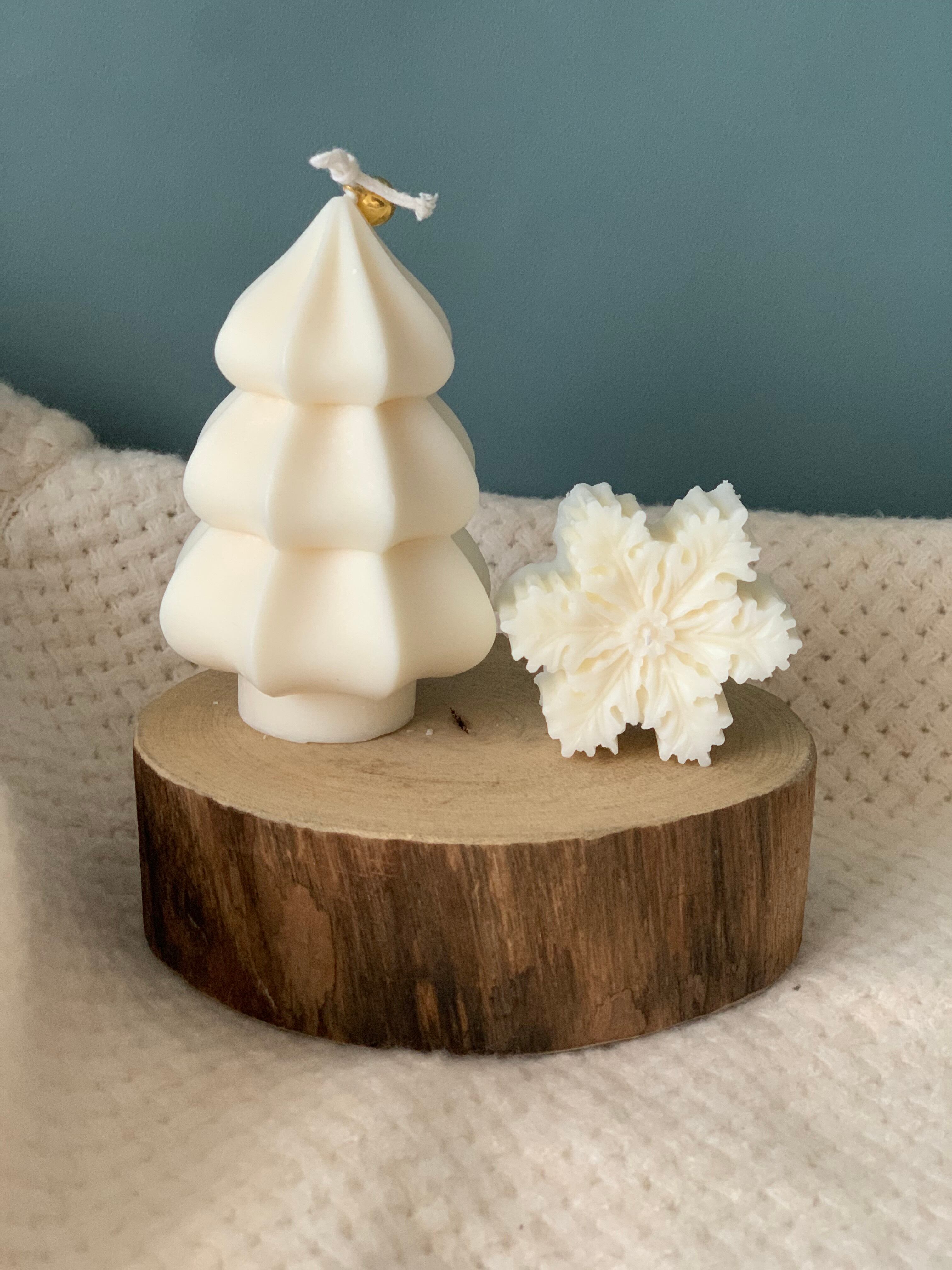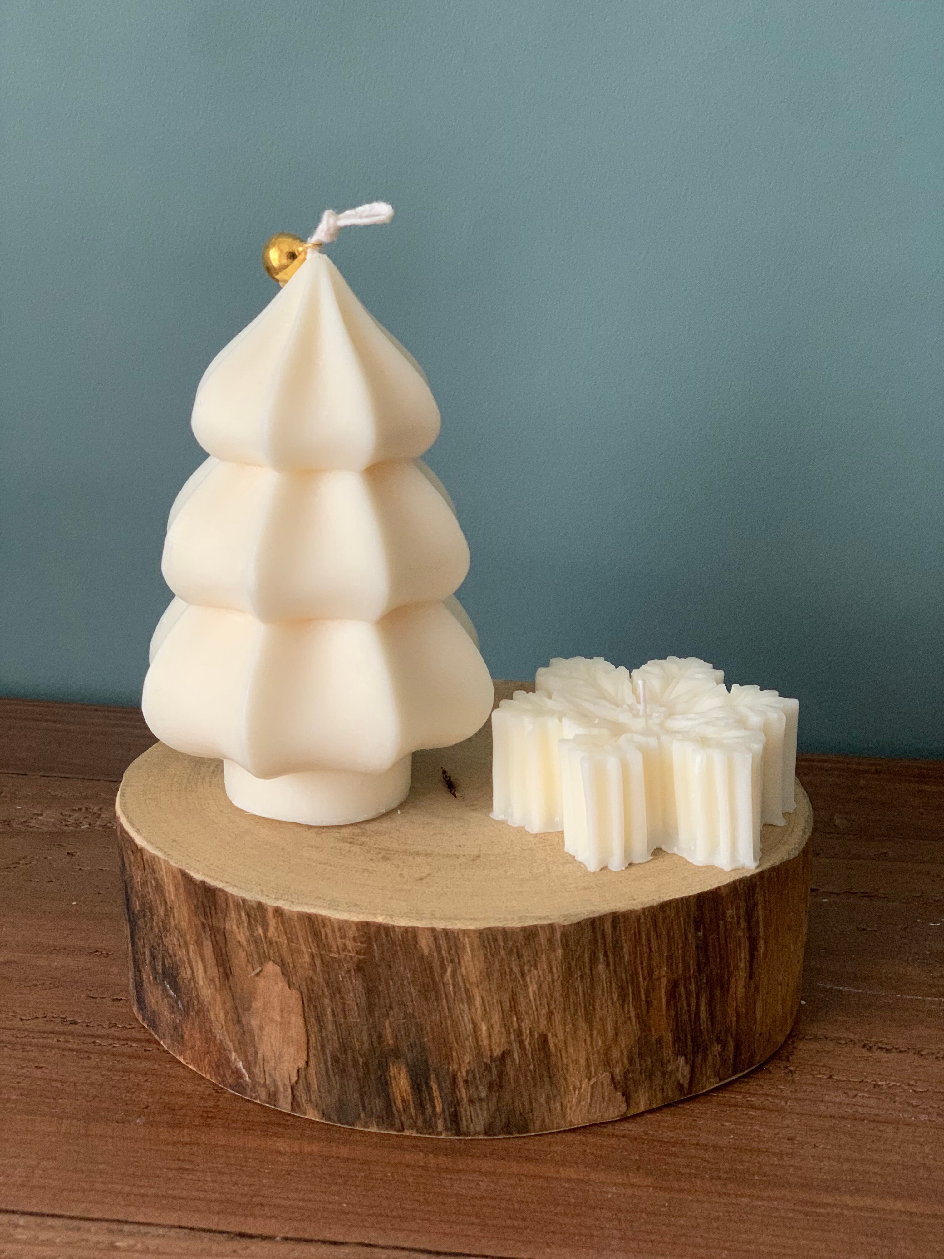 モクモクとした質感のツリーキャンドルと雪の結晶キャンドルのセットです。